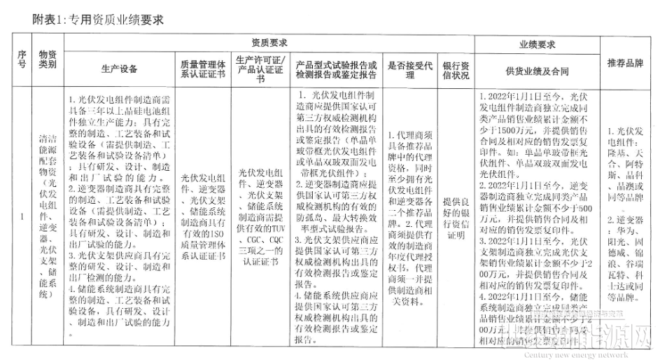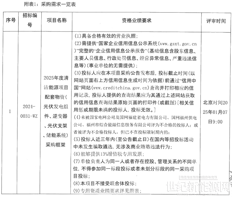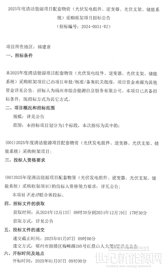 12月13日,福州市综合能源信息服务有限公司发布了2025年度清洁能源项目配套物资框采,其中包含光伏组件、逆变器、光伏支架、储能系统等。其中储能方面,招标要求储能系统制造商具有完整的制造、工艺装备和试验设备,具有研发、设计、制造和出厂试验的能力,而且储能系统供应商应提供国家认可第三方权威检测机构出具的有效的检测报告或鉴定报告。另外还要求2022年至今,储能系统制造商独立完成同类产品销售业绩累计金额不少于200 万元。