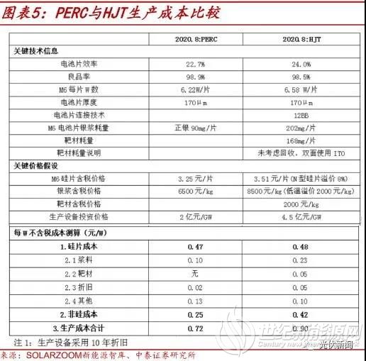 (2)在组件环节,HJT与PERC相比的主要成本劣势在焊带。根据当前PERC组件焊带的价格(70元/kg)和HJT组件焊带的价格(100元 /kg),HJT组件的每W成本比PERC高出不到 0.02元/W。但由于HJT电池片当前的转换效率达到24.0%,而PERC电池片当前的转换效率为22.7%,故而1.3%的转换效率优势约能带来 0.03元/W的组件非硅环节降本。综合来看, HJT组件环节的非硅成本并不比PERC高。