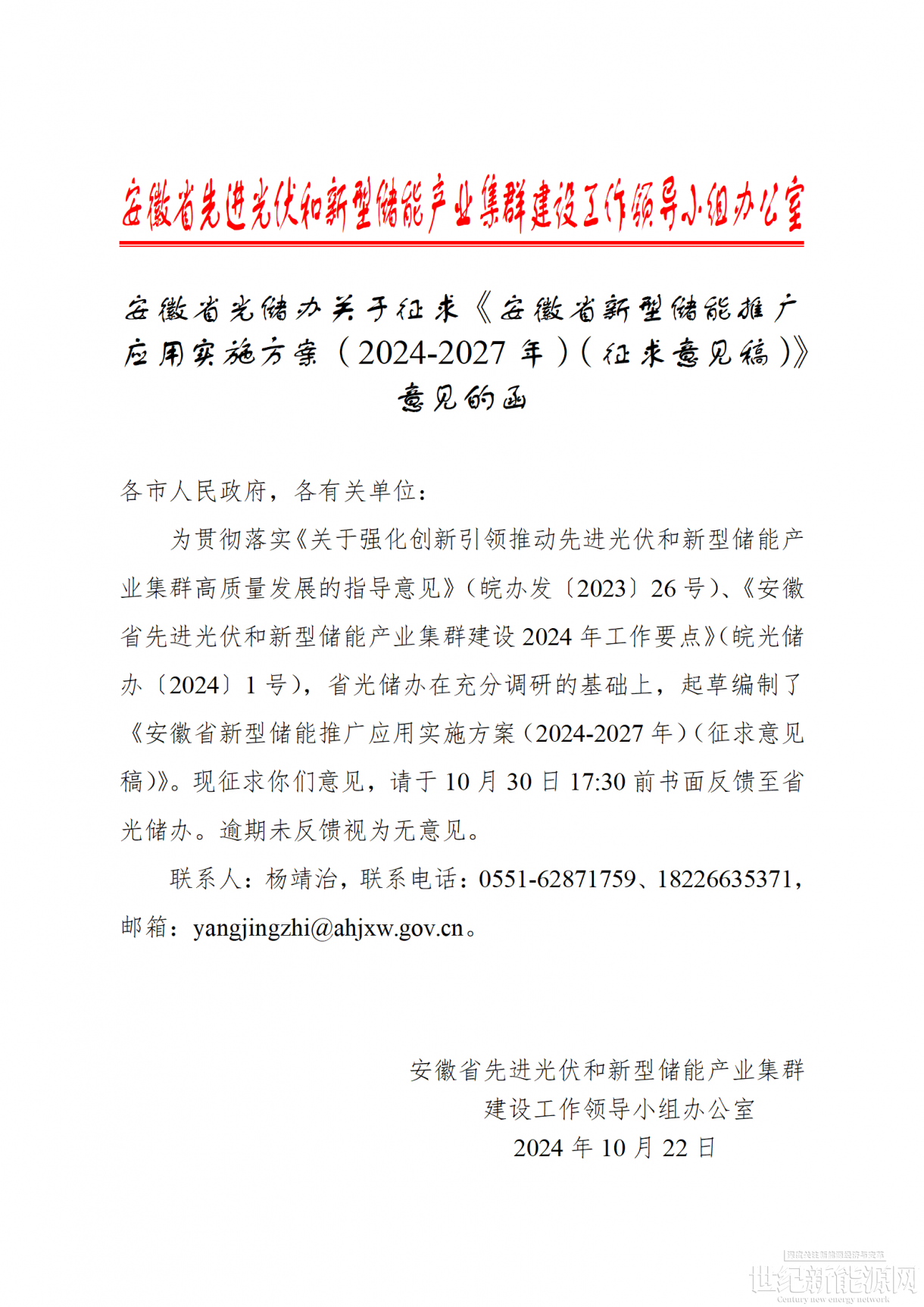 为尽快推动方案印发实施,加快推进新型储能推广应用,本次征求意见的期限为10个工作日。如有意见建议,请于2024年11月5日前填写《征求意见反馈信息表》,通过电子邮件方式反馈至dzxxc@ahjxw.gov.cn,邮件主题注明“新型储能推广应用方案意见建议”。