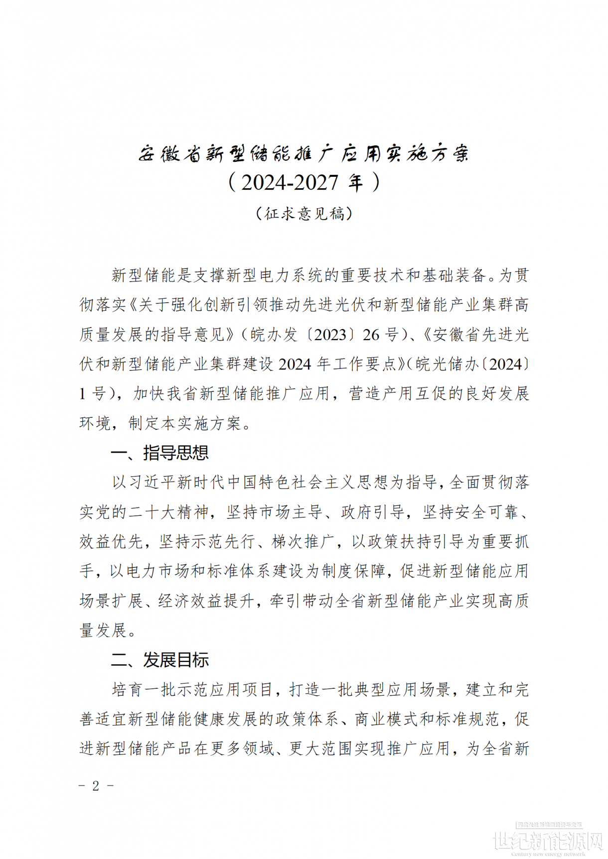 1. 《安徽省新型储能推广应用实施方案(2024-2027年)》(征求意见稿)