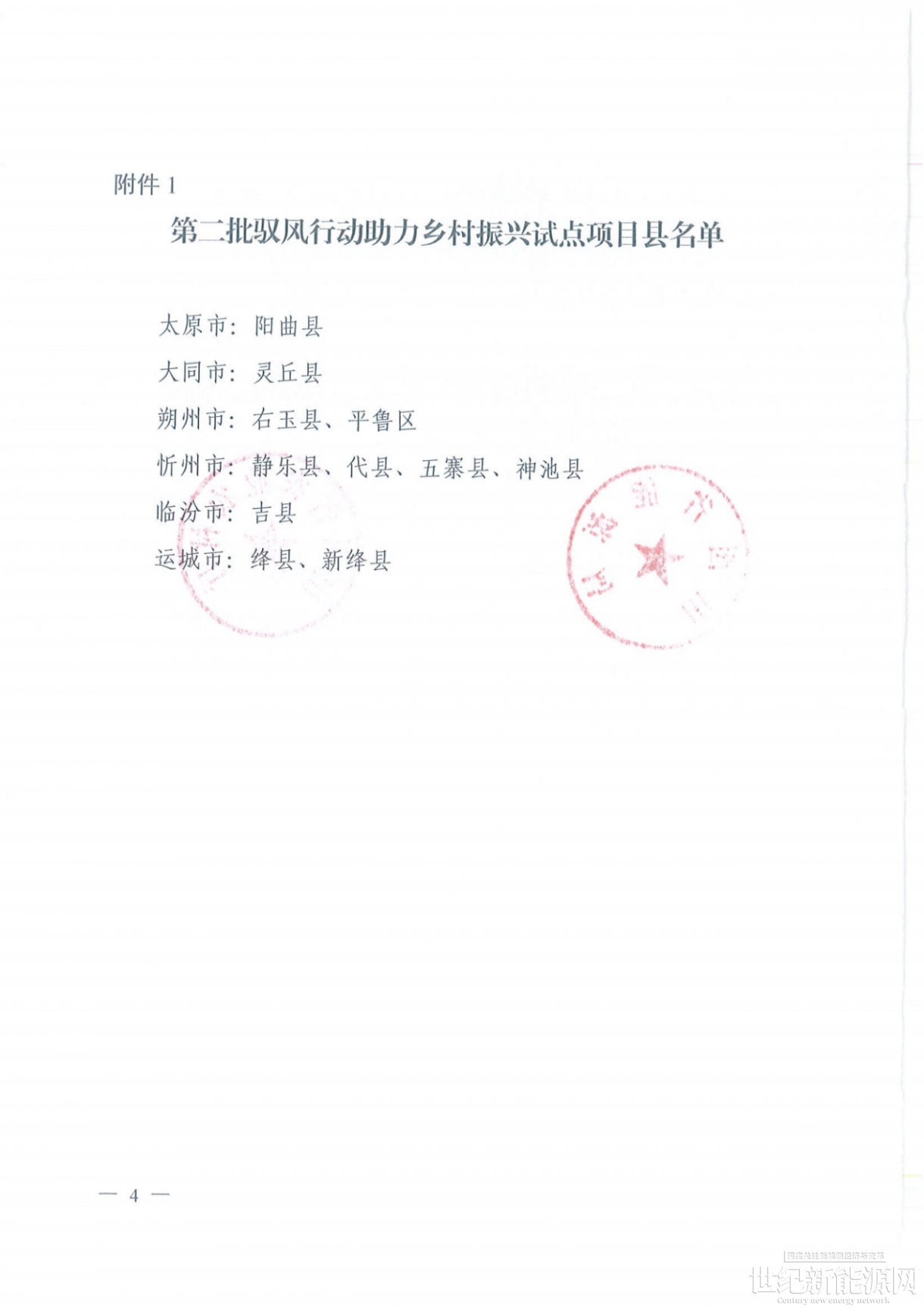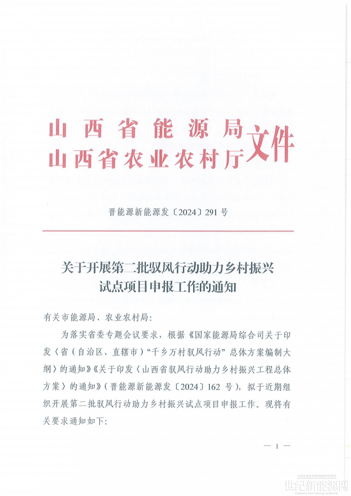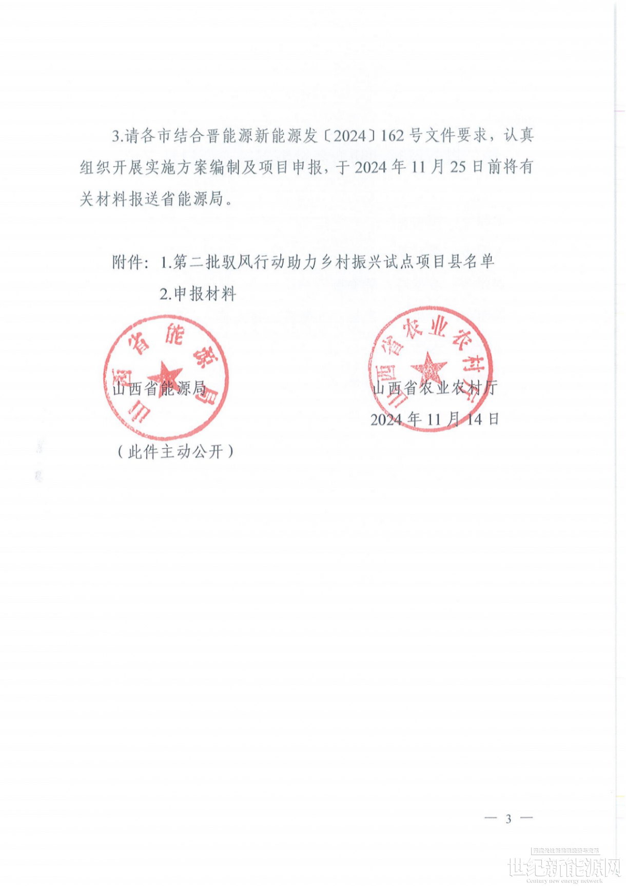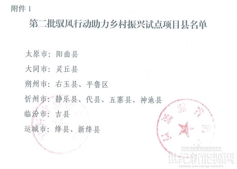 11月14日,山西省能源局、山西省农业农村厅联合发布《关于开展第二批驭风行动助力乡村振兴试点项目申报工作的通知》。《通知》显示,根据省农业农村厅提供的第二批驭风行动助力乡村振兴试点项目县建议名单,此次申报范围共计11个县(附件1)。申报总规模50万千瓦左右,其中每个县不超过5万千瓦,每个行政村不超过2万千瓦,力争2026年底建成。