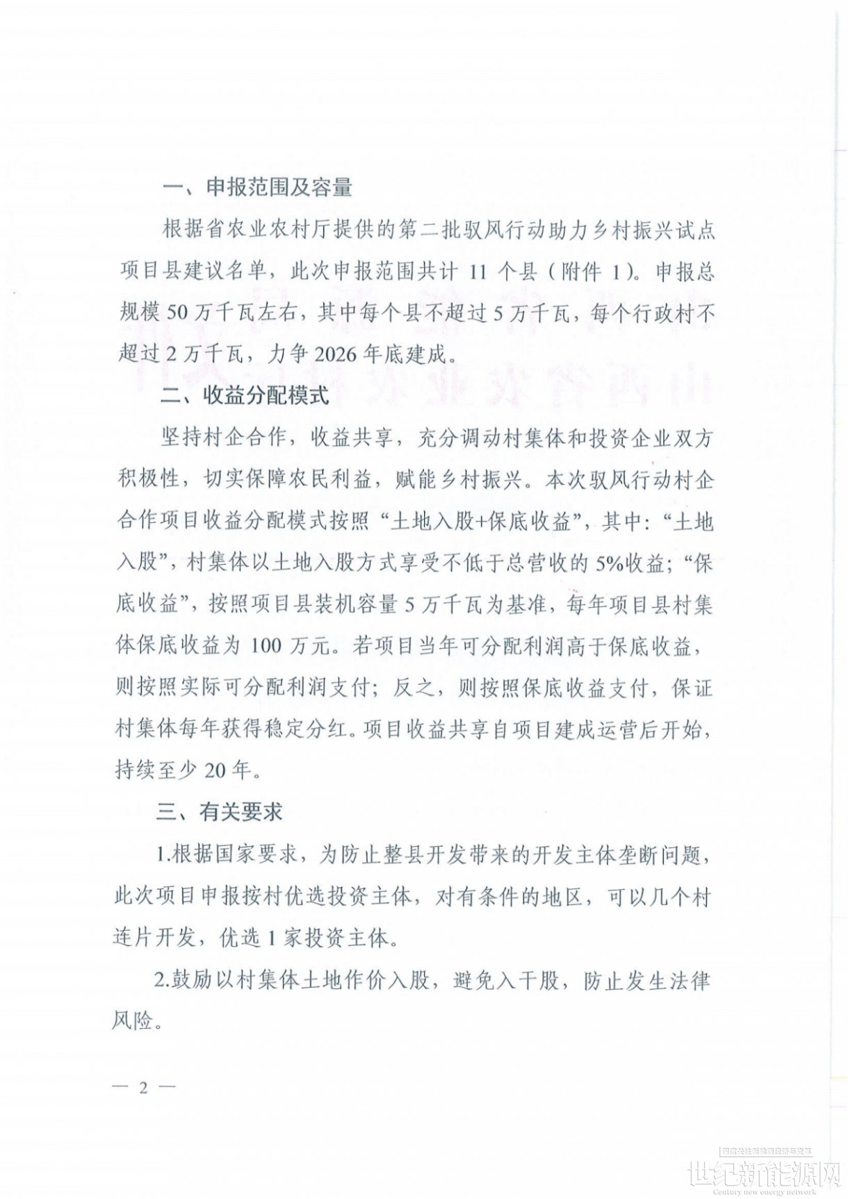 根据《通知》,本次驭风行动村企合作项目收益分配模式按照“土地入股+保底收益”,其中:“土地入股”,村集体以土地入股方式享受不低于总营收的5%收益;“保底收益”,按照项目县装机容量5万千瓦为基准,每年项目县村集体保底收益为100万元。若项目当年可分配利润高于保底收益则按照实际可分配利润支付;反之,则按照保底收益支付,保证村集体每年获得稳定分红。项目收益共享自项目建成运营后开始,持续至少20年。