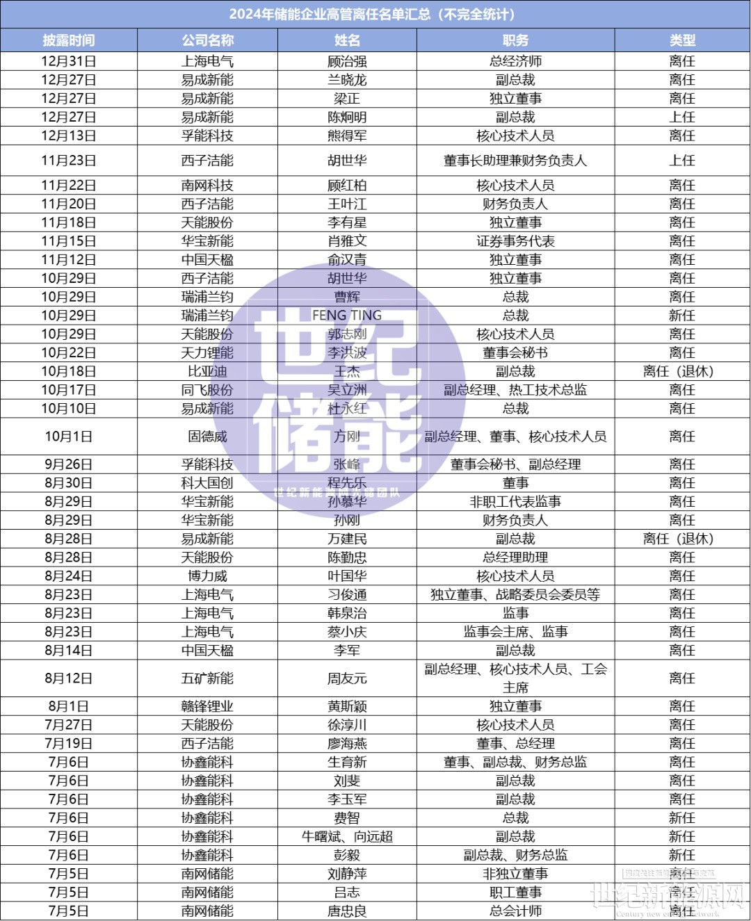 在这个充满变革与机遇的领域,各大企业高层的变动频繁,行业“抢人”大战愈演愈烈。据世纪储能不完全统计,2024年储能企业有超百位高管发生人事变动,其中不乏总裁、副总裁、董事长、总经理等重要职位。而这背后,或是储能产业的新洗牌与市场的激烈竞争。