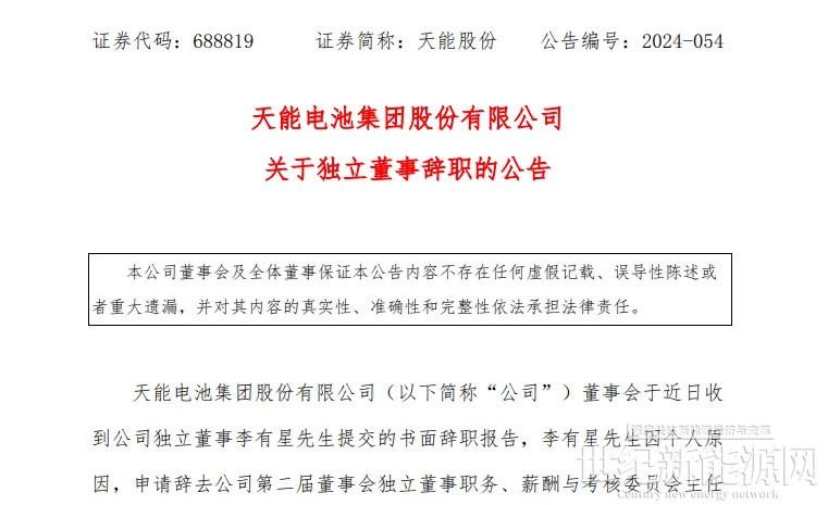 11月18日,天能股份独立董事李有星因个人原因,申请辞去公司第二届董事会独立董事职务、薪酬与考核委员会主任委员及提名委员会委员职务。