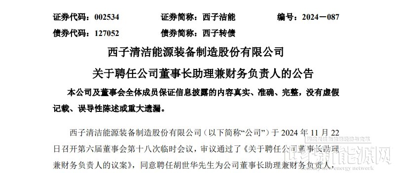 11月23日,西子洁能公告称,同意聘任胡世华先生为公司董事长助理兼财务负责人。
