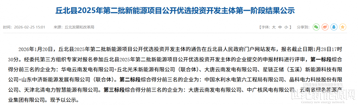 2月25日,云南丘北县2025年第二批新能源项目公开优选投资开发主体第一阶段结果公示,涉及华电、中电建、大唐等企业。