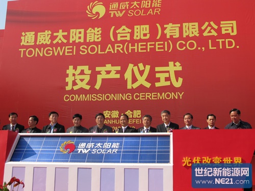 11月18日上午,通威太阳能(合肥)有限公司投产仪式在位于合肥市高新区的厂区隆重举行。著名经济学家、全国人大常委会原副委员长成思危专程发来贺电,中共安徽省委常委、合肥市委书记吴存荣,安徽省政协副主席、民建中央常委李修松,四川省工商联主席陈放,四川省经信委副主任张国斌,全国工商联新能源商会专业副会长曾少军,中国光伏产业联盟秘书长王勃华,中共合肥市委常委、秘书长杨思松,合肥市人民政府副市长吴建国,合肥市高新区管委会工委书记、管委会主任李兵,十一届全国政协常委、全国工商联新能源商会常务副会长、通威集团董事局主席刘汉元等领导莅临活动现场。光伏龙头企业昱辉、阿特斯、保利协鑫、顺风光电等国内外同行600余人共同见证,共襄盛举。