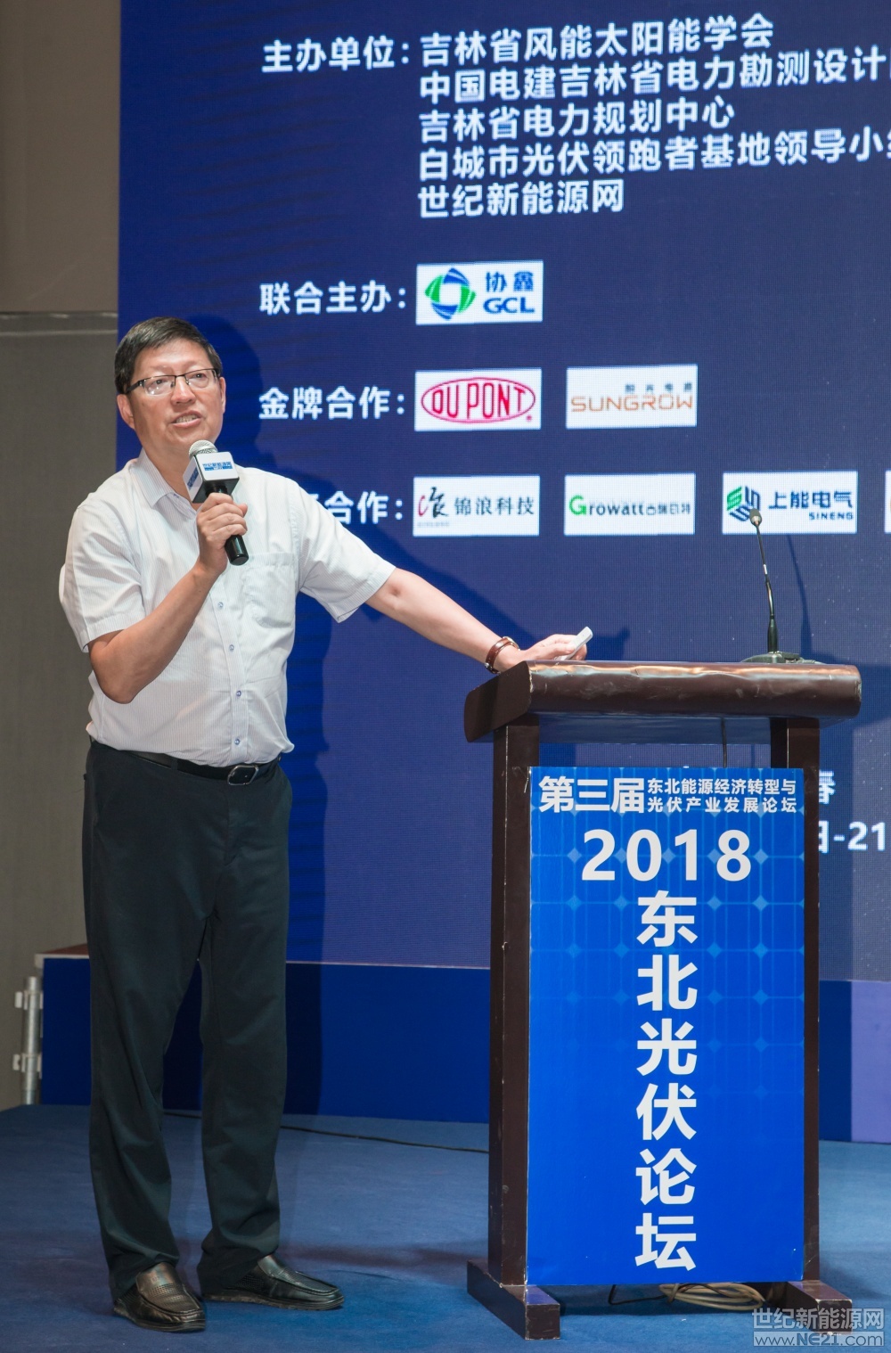 8月20-21日,第三届东北能源经济转型与光伏产业论坛在吉林长春举行,本届大会由吉林省 风能太阳能学会、吉林省电力勘测设计院、吉林省电力规划中心、白城市光伏领跑者基地领 导小组、世纪新能源网等单位共同主办。论坛上,国务院参事、国家能源专家咨询委员会副主任、国家气候专家委员会委员、原国家 能源局局长徐锭明;吉林省发改委原党组书记、副局长曹家兴;国家发改委国际合作中心能 源研究所所长王进;中国电力科学研究院新能源研究中心主任张军军;中国电建吉林省电力 勘测设计院院长、吉林省风能太阳能学会理事长姚飞;白城光伏领跑基地领导小组办公室主任、基地建设现场指挥部总指挥张晓波;中国电建吉林省电力勘测设计院新能源部主任李钦伟;白城光伏领跑者基地建设现场指挥部副总指挥王强;协鑫集成科技股份有限公司助理副总裁、国内销售总裁梁文章等众多光伏领域的企业精英、专家、学者出席论坛并发表演讲。